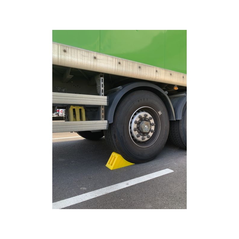 Butée de roue pour véhicule léger ou poids lourd et autocar. Réf. 300246 et 36951 fabriquées en caoutchouc dur résistant aux UV, huile et sel. Réf. 306617 fabriquée en PEHD. Excellente adhérence au sol et au pneu. Facile à manipuler et à ranger grâce à une sangle ou poignée de préhension solide.