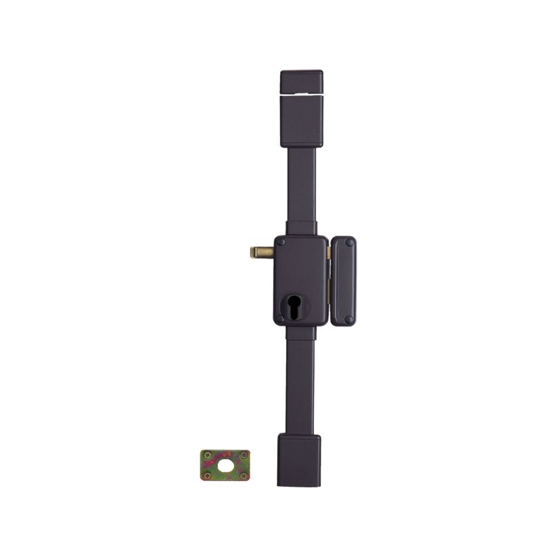 Acier embouti 20/10e. Pour porte de 1650 à 2250 mm. Rappel équerre du ½ tour. Pênes haut et bas en acier Ø 16 mm, tringles ajustables. Béquille double fournie pour modèle à fouillot. Livré avec gâche, sans cylindre (pour porte de 45 mm, prévoir cylindre 30 x 65 mm). Existe aussi en blanc, nous consulter. Coffre : 75 x 130 mm Axe : 45 mm Entraxe : 70 mm Fouillot carré : 7 mm Finition : marron Conditionnement : boite