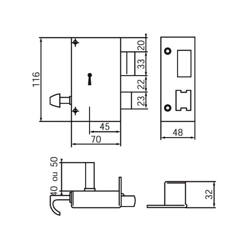Vertical, à fouillot, pour tout type de porte. Pêne ½ tour en acier zingué. Livré avec gâche et 2 clés. Coffre : 70 x 116 x 25 mm Canon : 40 mm Axe : 44 mm Entraxe : 68 mm Fouillot carré : 7 mm Course du pêne dormant : 16 mm Finition : époxy noir grainé Conditionnement : boite