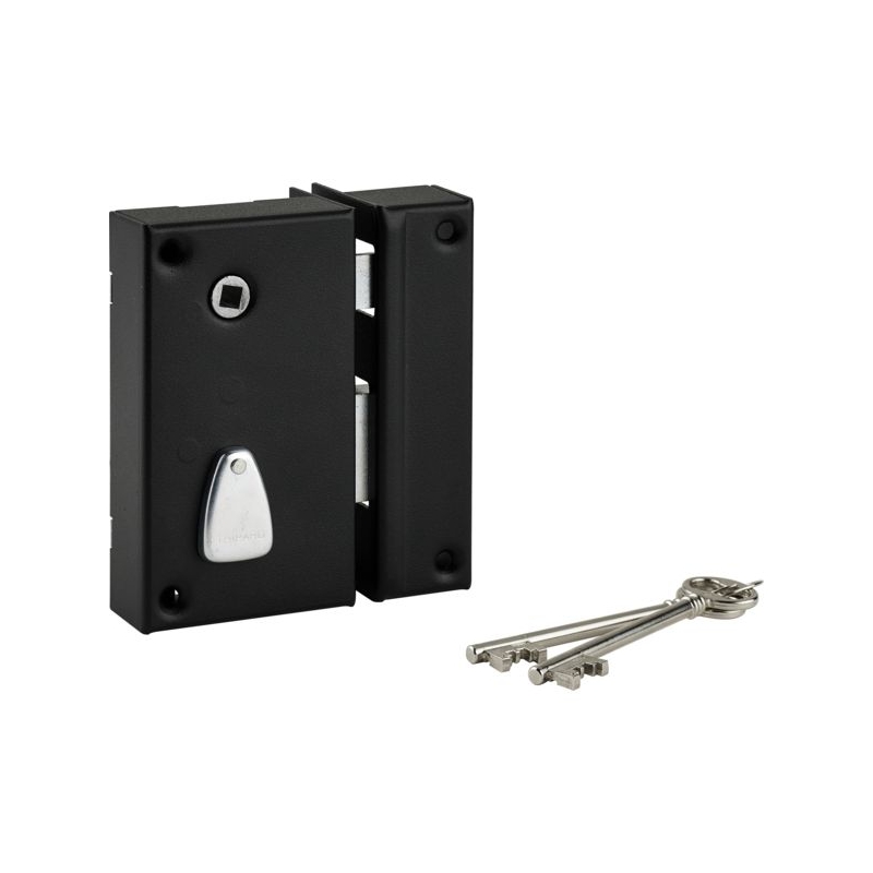 En acier cambré. Pêne ½ tour, et pêne dormant en acier. Mécanisme 6 gorges, 2 tours. Rappel à l'équerre. Livré avec gâche et 2 clés. Fouillot carré : 7 mm Canon : 45 mm Finition : époxy noir Dimensions modèle horizontal : Coffre : 140 x 88 mm Entraxe : 59 mm Dimensions modèle vertical : Coffre : 75 x 130 mm Entraxe : 70 mm Conditionnement : boite