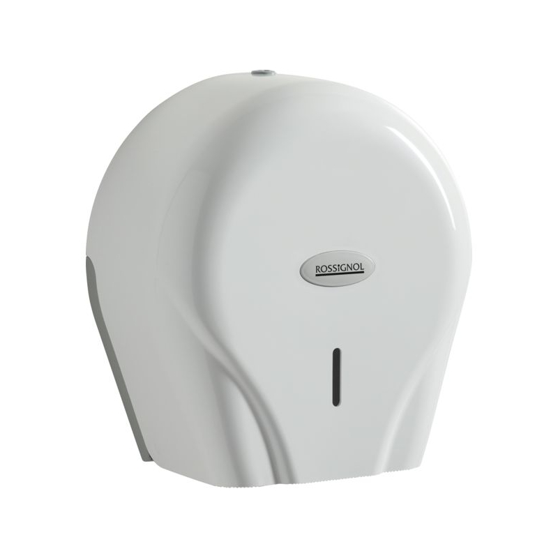 En ABS blanc pour rouleaux de papier hygiénique 200 et 400 m. Façade ouvrante avec serrure à clé, large fenêtre de contrôle du niveau de consommable. Déroulement du papier freiné par la forme du mandrin plastique. Bords ciselés pour une découpe facile du papier. Fixation murale.