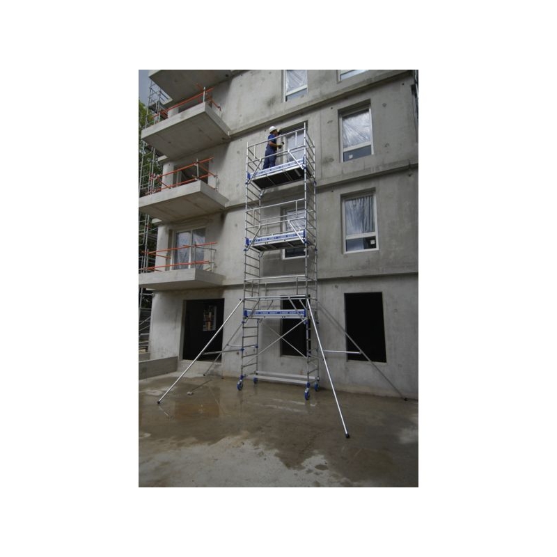 Utilisation sur sol plat ou dénivelé. Usage ultra intensif. En aluminium. Plancher alu/bois avec trappe d'accès et plinthes aluminium amovibles. Garde-corps monobloc. Système de liaison breveté Ergoblock pour un blocage fiable et d'un seul geste des stabilisateurs et des gardes-corps. Montage en sécurité par une seule personne. Roues Ø 200 mm réglables sur 175 mm tous les 12,5 mm. Stabilisateur réglable en longueur. Charge maxi. : 200 kg/m² Norme : NF - EN 1004-1 - Décret 2004-924