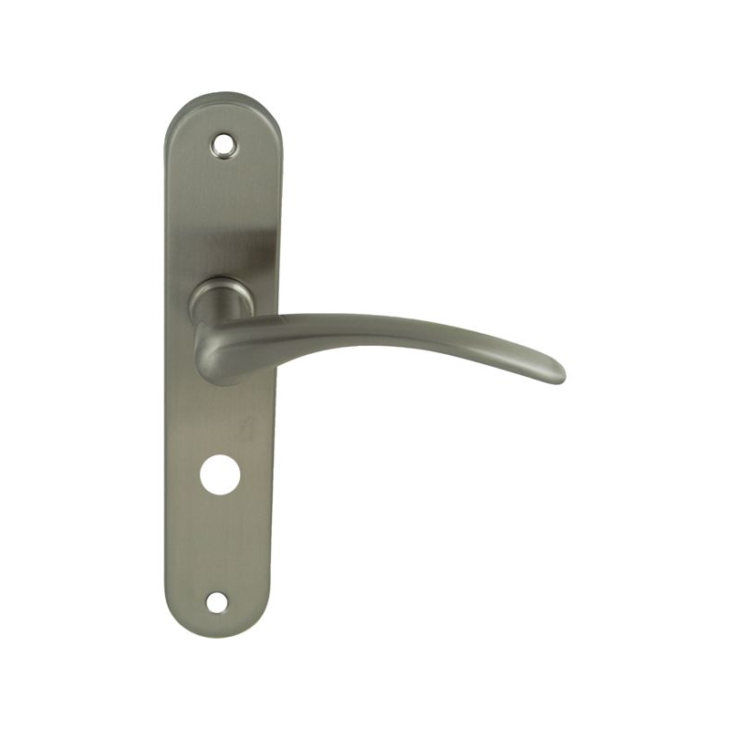 Pour porte intérieure d'épaisseur de 40 à 50 mm. Plaque : 193 x 38 mm Entraxe de fixation : 165 mm Entraxe de serrure : 70 mm Longueur béquille : 125 mm Saillie de la béquille : 56 mm Fouillot carré : 7 mm Matière : Aluminium /acier Finition : nickel mat Conditionnement : boite 100% recyclable.