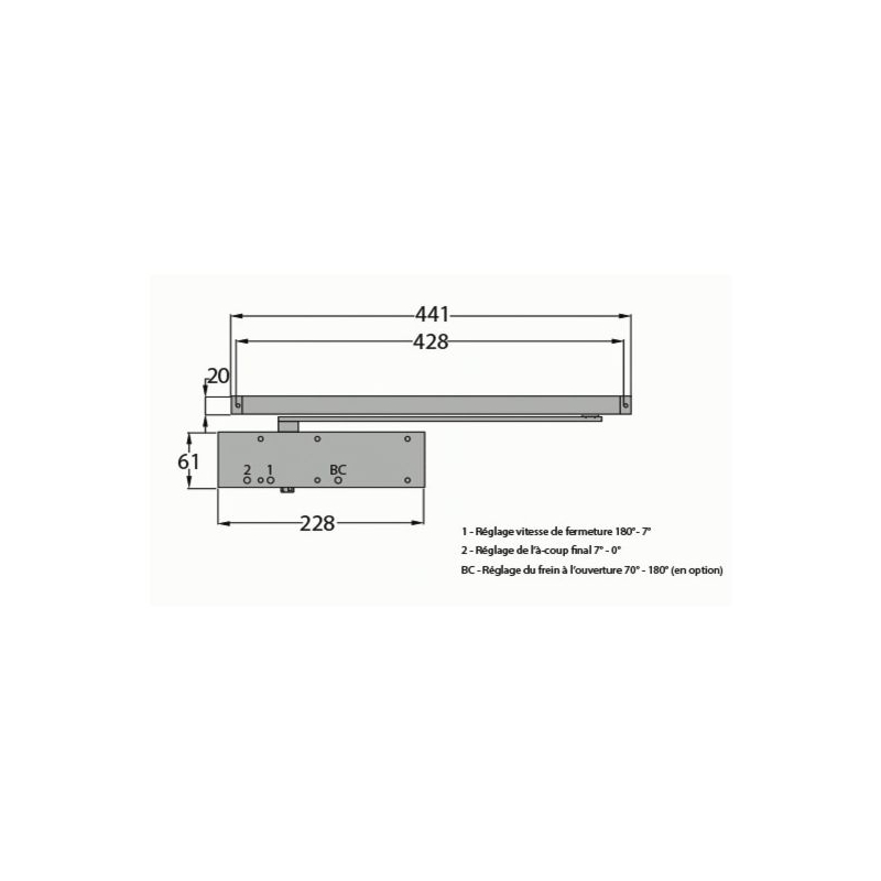 Technologie crémaillère elliptique à pignon asymétrique, bras à glissière anti-vandalisme. Force variable 3 à 4 réglable par vérin. Pour tout type de menuiseries: intérieures, extérieures, bois, alu, métallique, PVC, ... Permet d'équiper des vantaux jusqu’à 1100 mm de largeur et/ou 80 kg avec un angle d’ouverture allant jusqu’à 180°. Réglages en face avant facilement accessibles et dissimulés. Esthétique grâce à son bras sans fixations apparentes. Grande précision dans les réglages des vitesses grâce à ses vis à double empreinte: tournevis plat et clé Allen. Plage d’ouverture jusqu’à 180° côté paumelles. Réversible. Conforme aux normes NF EN 1154 et NF EN 1634 Homologué CE, CF/PF et PMR. Conditionnement : boite