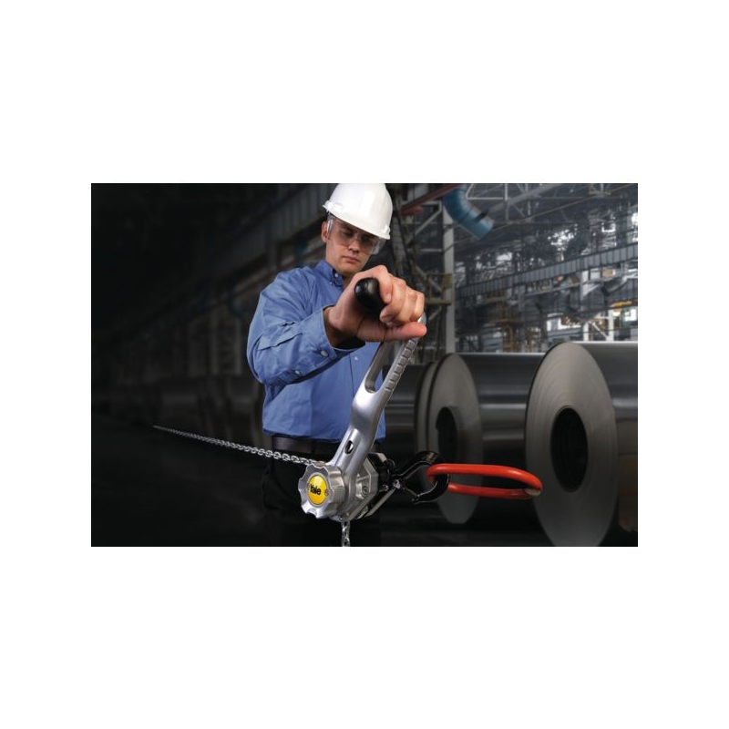 Corps aluminium, chaîne zinguée. Poignée rabattable dans le levier pivotant à 360°. Augmente la productivité, permet à l’opérateur de travailler jusqu’à 12 fois plus vite qu’avec un palan à levier conventionnel. Il n’est plus nécessaire d’utiliser son autre main pour stabiliser le palan. Indicateur de direction dans le levier: montée, descente, neutre.