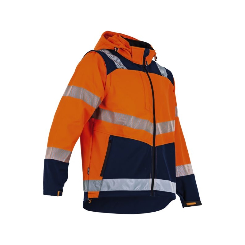 Softshell 3 couches 300 g/m² : 100% polyester + membrane TPU imper-respirante + polaire 100% polyester. Bandes rétroréfléchissantes segmentées et cousues : 2 ceintures, 4 brassards, 2 épaules. Empiècements contrastants bleu marine antisalissures : épaules, poignets, capuche et bas. Capuche amovible par zip et ajustable par élastiques et stoppeurs, doublée filet. Poignets ajustables par pattes PVC. Manches amovibles, fermeture centrale par zip étanche + protège menton. Dos long. Ceinture ajustable par élastiques et stoppeurs. 2 poches basses, 1 grande poche intérieure avec zip caché sous patte. Coloris : jaune fluo/marine, orange fluo/marine Taille : 2 à 5 Norme : CE Cat II - EN ISO 20471 (2) et (1) sans manches